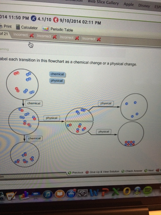 Identify each transition in this flowchart as a chemical or a physical change. Label each transition in this flow chart as a chemical change or a ... Thus, this is a physical change. In transition 4, the following reaction is verified. B₂ ⇒ 2 B. A new substance (B) has been formed, so this is a chemical change. In transition 5, molecules are closer but their identity doesn´t change. Thus, this is a physical change. Referring to the attached picture, transitions 1, 2 and 4 are chemical ... Sapling Learning Ch. 3 Flashcards - Quizlet Label each transition in this flow chart as a chemical change or a physical change. A to B: sets of two red and blue balls just floating around not mixing A to B: same but red and blue sets mixed. B to C: formed sets of threes where there are two blue and one red in each set. Solved Identify each transition in this flowchart as a | Chegg.com Question: Identify each transition in this flowchart as a chemical change or a physical change. physical chemical o 8 chemical 8. chemical chemical Answer Bank chemical physical This problem has been solved! See the answer Show transcribed image text Expert Answer PHYSICAL PROCESS is that process in which there is no bond … View the full answer EOF