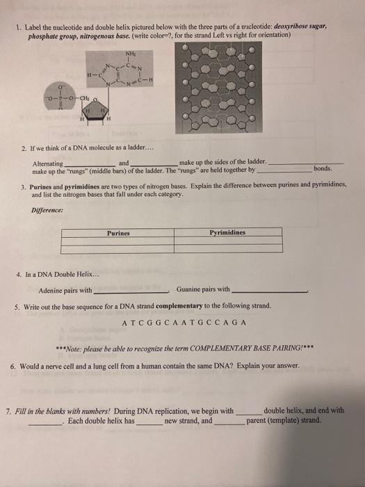answersheet - 1. Refer to the diagram in Model 1. a. What are the three ... Locate this drawing in Model 1. a. ... 3. On the ladder model of DNA label each of the bases with the letter A, T, C, or G. Okay. 4. Refer to Model 1. When one nucleotide contains adenine, what type of base is the ... parts of a nucleotide; 3 pages. Kami Export - DNA_Structure_and_Replication_Notes.pdf. New Jersey Institute Of Technology. CC 87. What are the Three Parts of a Nucleotide? | Albert.io Nucleotides are made up of 3 parts. The first is a distinct nitrogenous base, which is adenine, cytosine, guanine or thymine. In RNA, thymine is replaced by uracil. These nitrogenous bases are either purines or pyrimidines. Base pairs are formed when adenine forms a hydrogen bond with thymine, or cytosine forms a hydrogen bond with guanine. Nucleotide - Definition, Structure (3 Parts), Examples & Function A nucleotide is made up of three parts: a phosphate group, a 5-carbon sugar, and a nitrogenous base. The four nitrogenous bases in DNA are adenine, cytosine, guanine, and thymine. RNA contains uracil, instead of thymine. A nucleotide within a chain makes up the genetic material of all known living things. PDF Draw And Label Nucleotide 'name 3 parts to a nucleotide then draw and label one june 22nd, 2018 - a nucleotide is made up of a nitrogenous base a five carbon sugar and one to three phosphate groups the phosphate group forms bonds with the carbons in the sugar group' 'biomed pltw eoc study set flashcards quizlet june 14th, 2018 - start studying biomed pltw eoc study set …