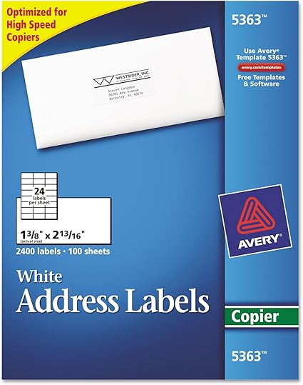 Avery Address Labels for Copiers 1-3/8" x 2-13/16", 2,400 ... - Walmart.com Arrives by Fri, May 27 Buy Avery Address Labels for Copiers 1-3/8" x 2-13/16", 2,400 White Labels (5363) at Walmart.com