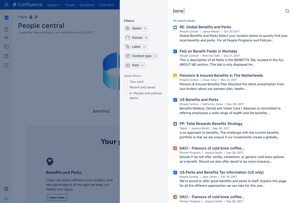 Retained search terms for Confluence 🙌 - Atlassian Community I'm Christina Ristevski, a Product Manager working on Confluence Cloud Search. I'm excited to share a new search feature with you all! Have you ever landed on a page via Confluence Search and realized, actually no this isn't the right page I was looking for , only to go back to an empty search bar with your previous search query missing.