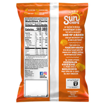 Home | Sunchips SunChips - Be Your Own Wave #2 YouTube Video. Instagram Post: Drop a in the comments to celebrate this fiery sign! (opens a new window) Instagram Post: No matter the weather, it's always sunny with SunChips in-hand. (opens a new window) Instagram Post: Always look for the wavy side of life. (opens a new window) Instagram Post: Summer vibes ... SunChips Garden Salsa Multigrain Snacks - H-E-B 7 oz $3.79 ($0.55/oz) Product description SUNCHIPS snacks are wavy, ripple-y squares full of whole-grain goodness. Grab a bag of SUNCHIPS multigrain snacks in your favorite flavor, and tell your taste buds to meet you at the corner of delicious and wholesome. Preparation instructions Guaranteed fresh until printed date. Calories in Sunchips - Calorie, Fat, Carb, Fiber, & Protein Info Calories in Sunchips based on the calories, fat, protein, carbs and other nutrition information submitted for Sunchips. Calories in Sunchips based on the calories, fat, protein, carbs and other nutrition information submitted for Sunchips. ... Serving Size: 1 oz. Calories in Sunchips. Calories : 140.0: Total Fat : 6.0 g: Saturated Fat : 0.0 g ... Sunchips Original Snacks Nutrition Facts - Eat This Much For a Serving Size of 1.5 oz. How many calories are in Sunchips Original Snacks? Amount of calories in Sunchips Original Snacks: Calories 210. Calories from Fat 90 ( 42.9 %) % Daily Value *. How much fat is in Sunchips Original Snacks? Amount of fat in Sunchips Original Snacks: Total Fat 10g.