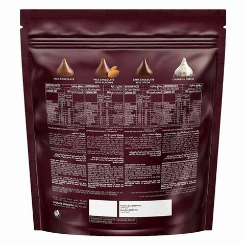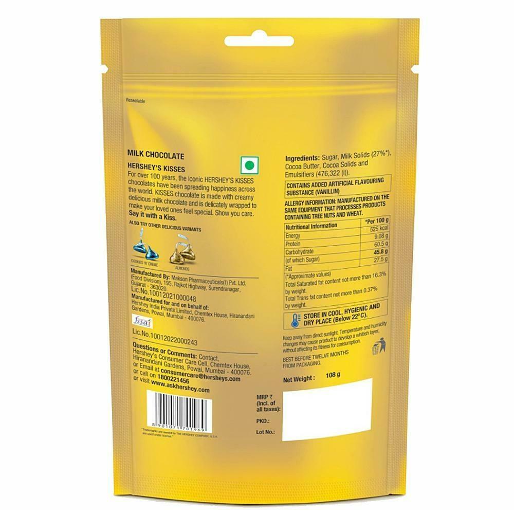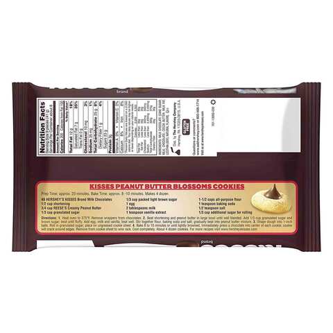 Hersheyland | Explore Hershey Products, Recipes, Crafts & More Hersheyland | Explore Hershey Products, Recipes, Crafts & More HERSHEY'S KISSES - Milk Chocolates - SmartLabel™ 4 Sept 2022 — Vitamin D 1.0mcg. 2% ; Calcium 64.0mg. 4% ; Iron 1.0mg. 6% ; Potassium 120.0mg. 2%. HERSHEY'S KISSES Cookies 'N' Creme, 100.8 g Enjoy HERSHEY'S KISSES Cookies 'N' Creme today. Ingredients. White Chocolate (89%), Milk Solids (33.5%), Sugar, Cocoa Butter, Cookies (11%), {Refined White Flour (Maida)}, Edible Vegetable Oil (Palm Oil), Cocoa Solids (1.13%), Emulsifiers (322(i), 476) and Flavor (Artificial Flavoring Substance - Vanilla). ... Additional Label Information ... HERSHEY'S KISSES Milk Chocolate, 108 g HERSHEY'S KISSES is made with creamy delicious milk chocolate and is delicately wrapped to make your loved ones feel special. Show you care. Say It with a Kiss! Ingredients. Sugar Milk Solids (23.9%*), Cocoa Butter, Cocoa Solids (12.5%*), Emulsifiers (322(i), 476) and Flavor (Artificial Flavoring Substance - Vanilla). Allergens. Contains Milk and Soy.