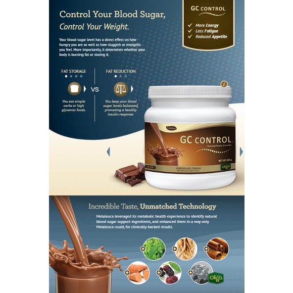 Melaleuca Shakes Make the Perfect Blend - Melaleuca Journal Using six powerful natural blood sugar support ingredients, enhanced in only a way Melaleuca can, GC Control delivers results. 120 Calories 4g Total Fat 1g Sugar 9g Fiber 5g Net Carbs 10g Protein GC Control Shakes are available in: Caramel Crème Brulée Fresh Apple & Cinnamon French Vanilla Creamy Chocolate Fusion Peach Cobbler