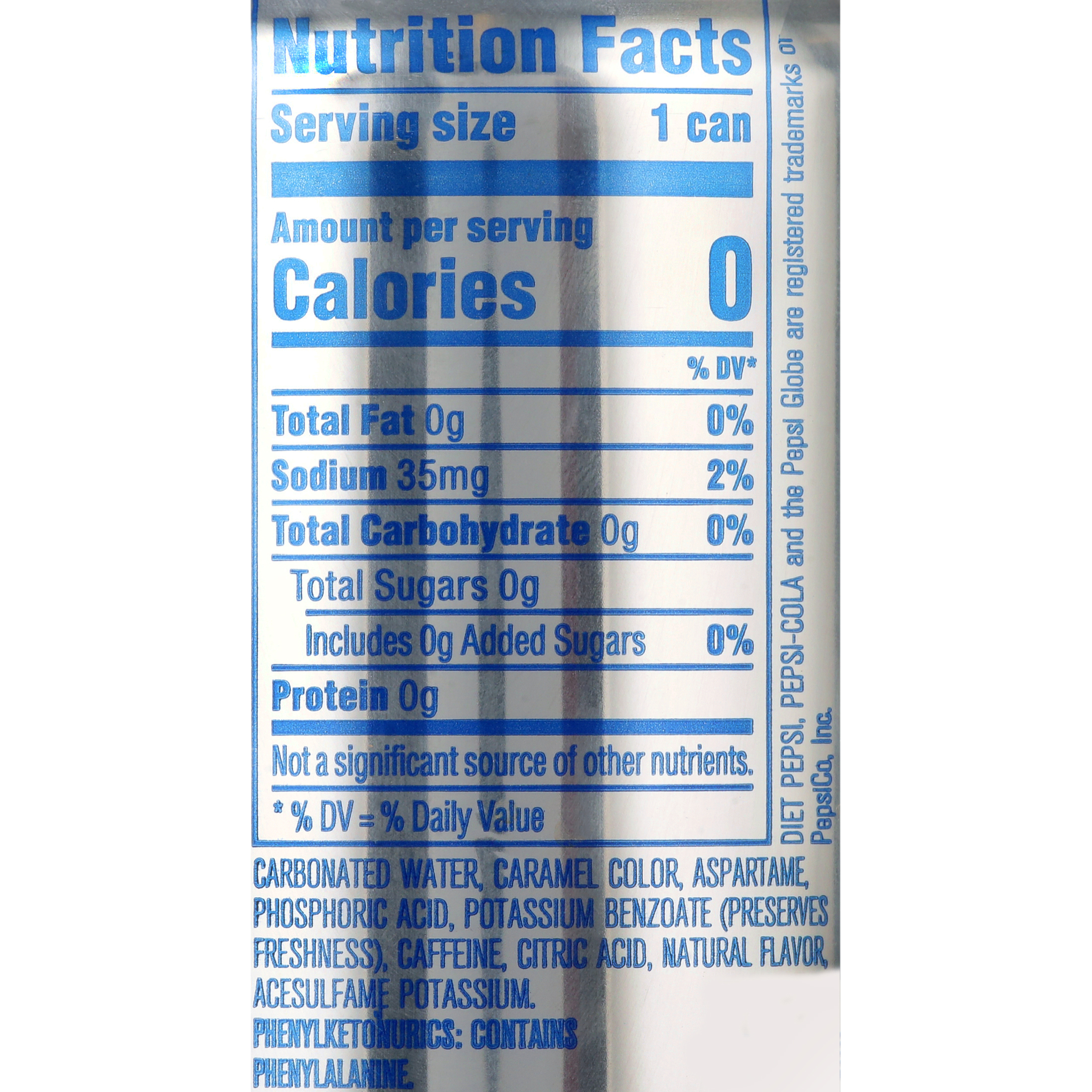 Pepsi nutrition facts label. Calories in Pepsi - Nutritionix Nutrition Facts Pepsi Serving Size: can (357g ) Amount Per Serving Calories 150 Calories from Fat 0 % Daily Value* Total Fat 0g 0 % Sodium 30mg 1 % Total Carbohydrates 41g 14 % Sugars 41g Protein 0g 0% Calcium 0% Iron * Percent Daily Values are based on a 2000 calorie diet. Cholesterol Free Low Cholesterol Fat Free Low Fat Saturated Fat Free Pepsi Diet Cola 12 oz Bottles - Shop Soda at H-E-B Shop Pepsi Diet Cola 12 oz Bottles - compare prices, see product info & reviews, add to shopping list, or find in store. ... Nutrition Facts. Diet Cola 12 oz Bottles. Serving Size 12.00 fl oz(360ml) ... Always read labels, warnings and directions before using or consuming a product. View full Product Information Disclaimer. $7.17. Add to list Diet pepsi caffeine free cola 2 liter plastic bottle by PepsiCo UPC 00012000004964. Diet pepsi caffeine free cola 2 liter plastic bottle by PepsiCo contains 0 calories per 360 g serving. This serving contains 0 g of fat, 0 g of protein and 0.1 g of carbohydrate. The latter is 0 g sugar and 0 g of dietary fiber, the rest is complex carbohydrate. Diet pepsi caffeine free cola 2 liter plastic bottle by PepsiCo ... Calories in Pepsi - Nutrition Facts for Pepsi - MyDietMealPlanner.com Total carbs in a Pepsi is 41 (g), 14% of daily value. Sugar in a Pepsi is about 41 g and the amount of protein in a Pepsi is approximately 0 g. Please refer to the nutrition facts label seen to the left for a full breakdown of complete nutrition found in a Pepsi .