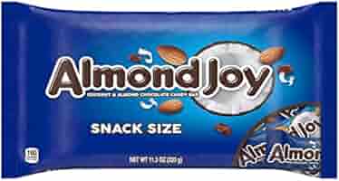 Almond Joy Coconut & Almond Chocolate Snack Size Candy Bars Almond Joy Coconut & Almond Chocolate Snack Size Candy Bars 3 oz, 5 pk $1.22 ($0.41/oz) Icon details Product description Take your taste buds on a tropical vacation! These snack sized bars of sweet coconut and crunchy almond chocolate candy bars are the perfect escape from your daily routine.