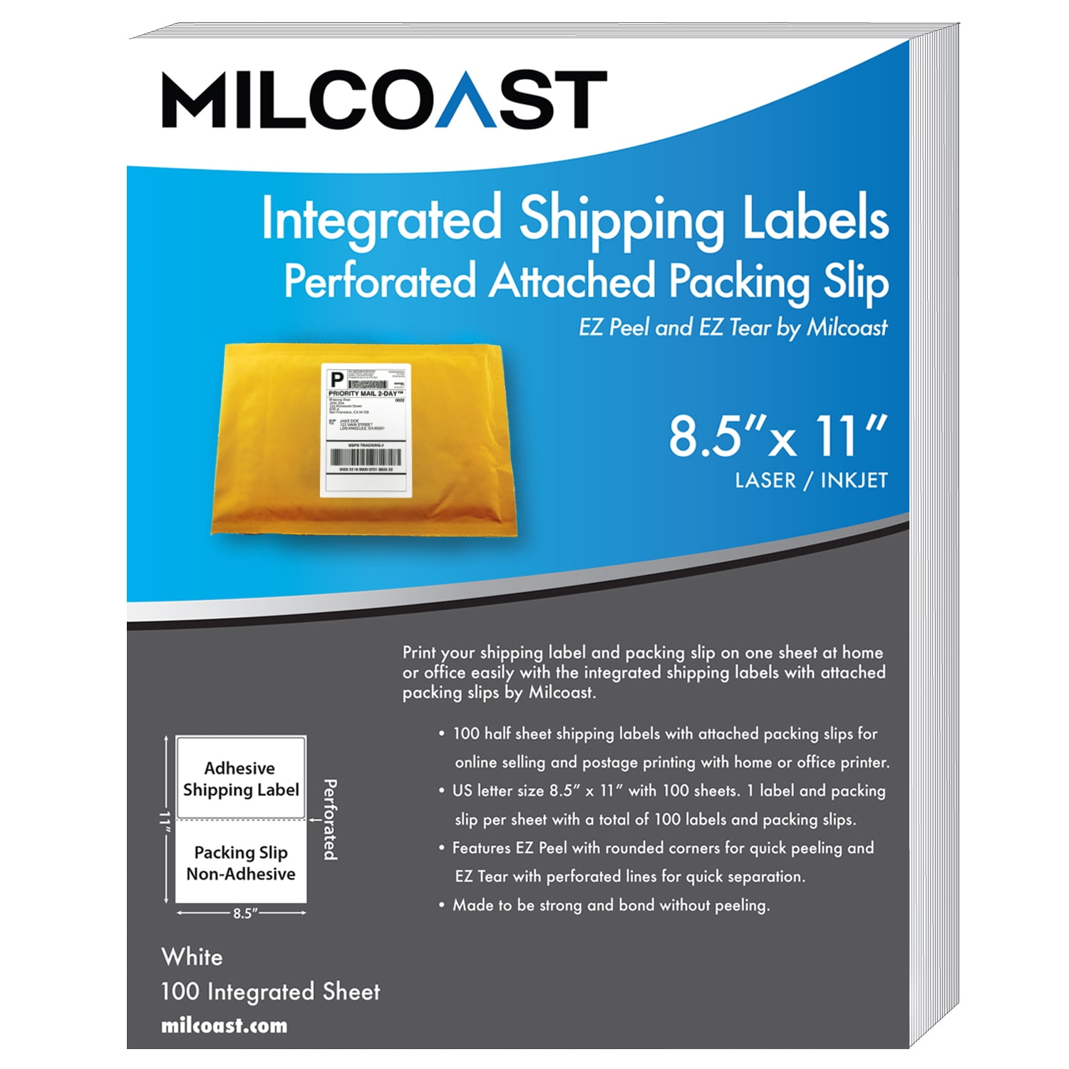 Milcoast Integrated Shipping Labels with Perforated Attached Packing Slip - For Inkjet / Laser Printers (100 sheets)