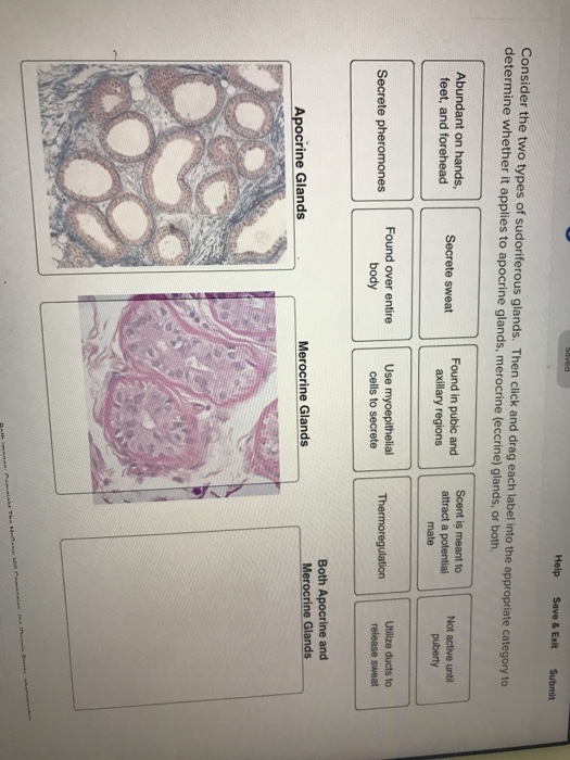 Solved Drag each label to the type of gland it describes ... Question: Drag each label to the type of gland it describes. Sebaceous Glands 22 Apocrine Secrete products via exocytosis Secrete products via apoptosis Holocrine Sweat secreting Secrete products mostly onto hair follicles Sudoriferous Glands Secrete directly onto the skin Surface Oil producing Morocrine Secretions are 99% water and slightly acidic pH. Solved drag each label to the type of gland it describes ... drag each label to the type of gland it describes (sebaceous glands or sudoriferous gland) -merocrine -secrete products via apoptosis -sweat secreting -secrete products mostly onto hair follicles -secrete products via exocytosis -holocrine -oil producing -apocrine Expert Answer 100% (2 ratings) Previous question Next question