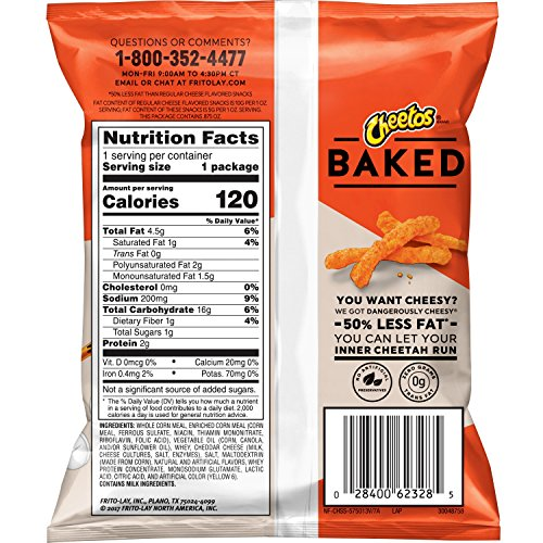 grocerynutrition.org › cheetosCheetos Nutrition Facts Cheetos Nutrition Facts Select a Cheetos product below to view the full nutrition facts, Weight Watchers points and ingredients. Our database currently contains 77 items from Cheetos. Bag Of Bones Cheese Snacks, White Cheddar Bag Of Bones Snacks, White Cheddar Cheese Baked Crunchy Cheese Flavored Snacks 7.625 Ounce Plastic Bag › productsProducts | Cheetos Find your favorite CHEETOS® snacks and discover hot, spicy new flavors. › calories-nutrition › cheetosCalories in Cheetos Baked Cheetos (Package) and Nutrition Facts -... Aug 2, 2022 · Baked Cheetos (Package) Nutrition Facts Serving Size 1 package (1.5 oz) Amount Per Serving Calories 200 % Daily Values* Total Fat 7.00g 9% Saturated Fat 1.500g 8% Trans Fat 0.000g Polyunsaturated Fat 4.000g Monounsaturated Fat 2.500g Cholesterol 0mg 0% Sodium 350mg 15% Total Carbohydrate 30.00g 11% Dietary Fiber 1.0g 4% Sugars 1.00g Protein 3.00g