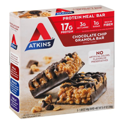 Atkins Protein-Rich Meal Bar Chocolate Chip Granola Bars - 5 ct 17 g protein. 3 g net carbs (Total carbs (18 g) - fiber (7 g) - glycerin (8 g) = 3 g Atkins net carbs) ... Is Your Nutrition Bar Right For You? | Atkins Conversely, all the Atkins Advantage® bars are lower in sugar, each having 3g or less of sugar. Choosing a Nutrition Bar That Is Right For You. It is important to understand that nutrition bars have a wide range of nutritional content — sugars, protein, fiber, calories and fat — and each individual has unique nutrition needs.