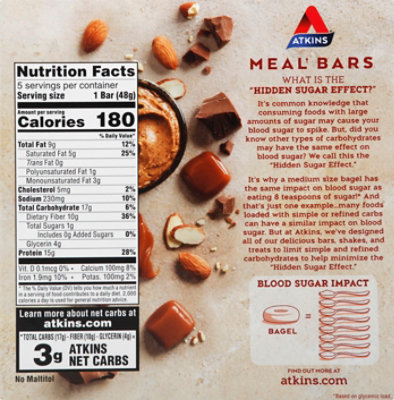 Atkins Protein Meal Bar, Chocolate Peanut Butter, 2.1 Oz Bars, 5 Ct Ingredients : ... 1013 02 CONTAINS MILK, SOY, PEANUTS. Legal Disclaimer : Statements regarding dietary supplements have not been evaluated by the FDA and are not ...